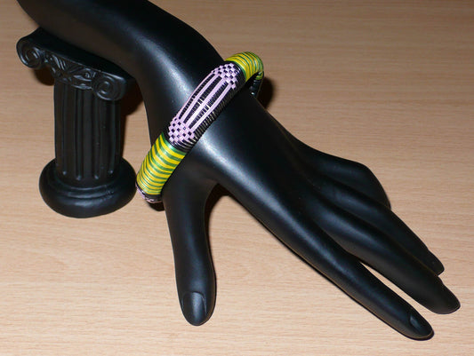 Collection de bracelets africains à motifs ethniques en plastique recyclé.