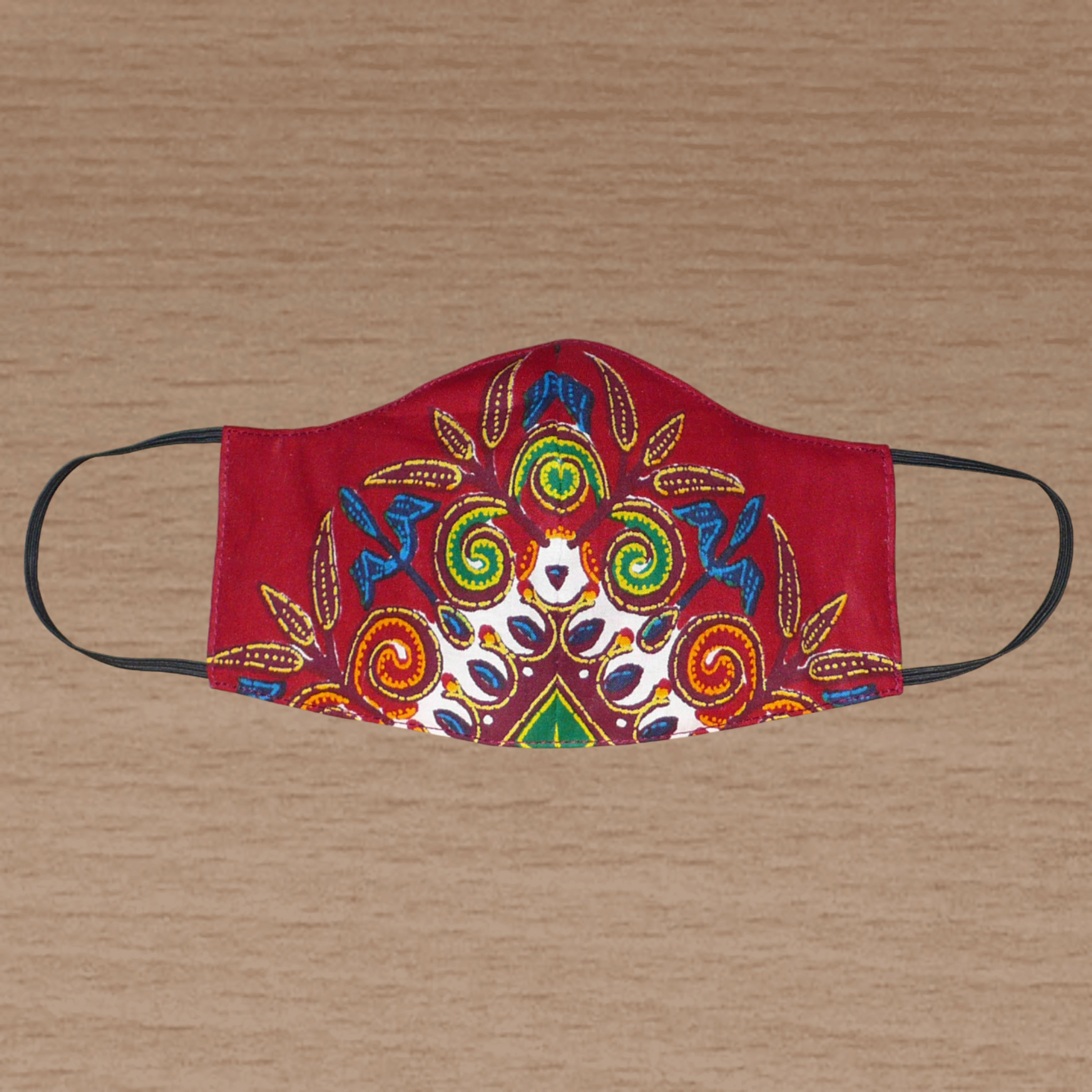 Masque facial en tissu africain bordeaux imprimé de motifs floraux multicolores ; il se porte avec des élastiques. En vue d'un usage éco-responsable, il est lavable et réutilisable.